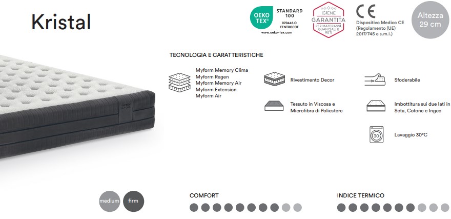 Note: Altissime prestazioni di Confort. Disponibile in 2 portanze: Rigida e Media. Rivestimento con imbottitura in Seta e Cotone, sfoderabile e lavabile a 30°, Dispositivo Medico Detraibile