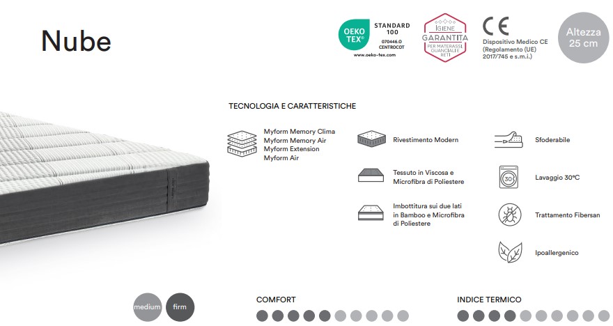 Note: Confortevole e versatile. Disponibile in 2 portanze: Rigida o Media; rivestimento sfoderabile e lavabile in lavatrice 30° con trattamento Fibersan Antiacaro. Dispositivo Medico Detraibile.
