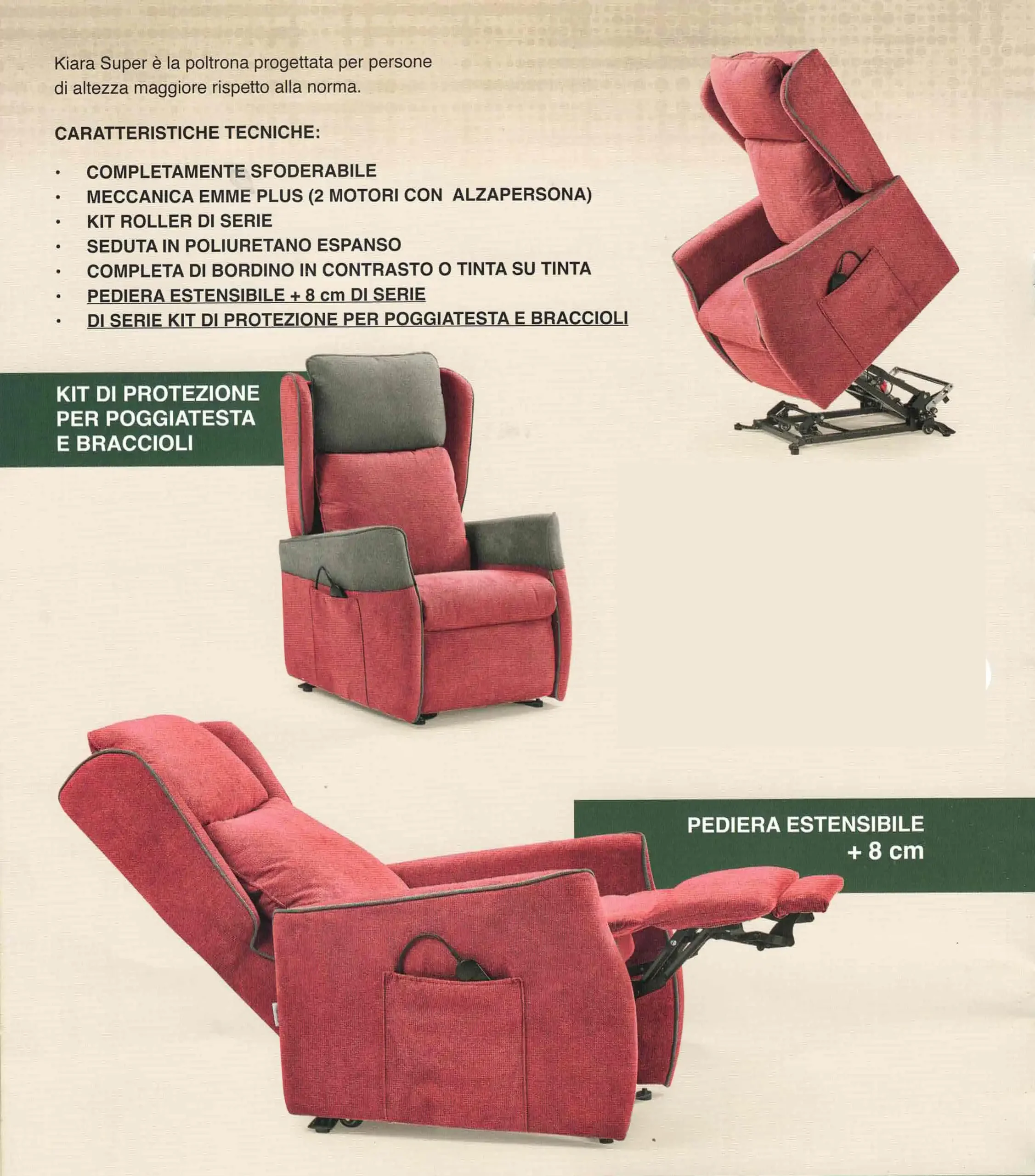 Note: Pediera e schienale regolabili separatamente, movimento alza-persona, Kit Roller di Serie, copertura aggiuntiva per testiera e braccioli, pediera con extra estensione 8 cm,  Dispositivo Medico Detraibile