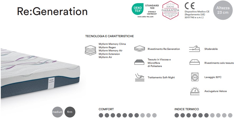 Tipo: Memory HD + Myform Regen termoregolante + Memory clima – Rivestimento in tessuto tridimensionale – alto 23 cm